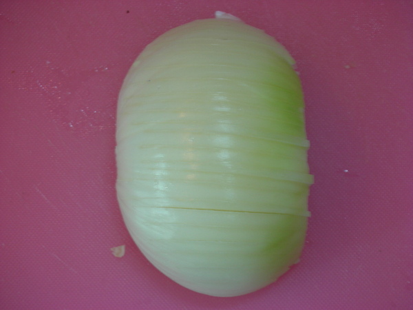 首先,把對半切好的洋蔥直切