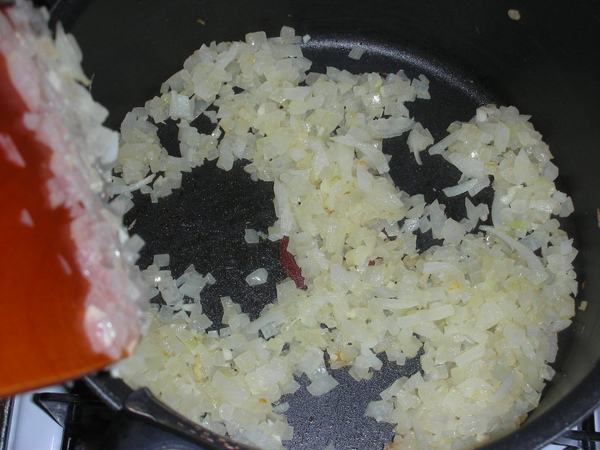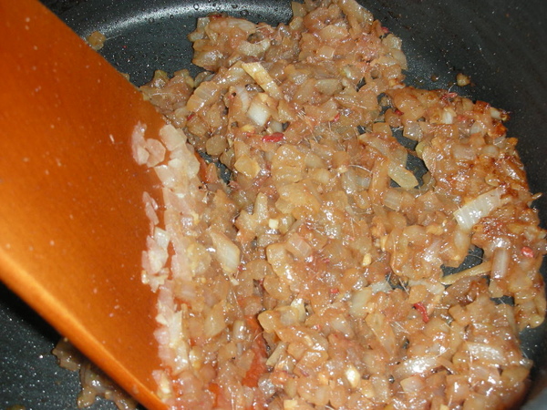 2. 橄欖油炒香大蒜,放入洋蔥炒至有點淡咖啡色