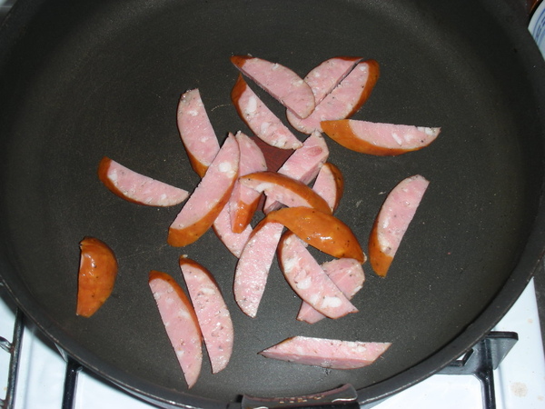 6. 平底鍋先煎香煙燻香腸,起鍋後把鍋中餘油擦乾淨