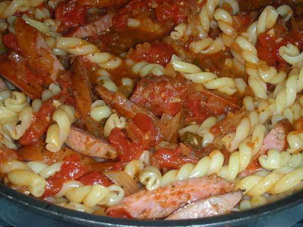 7. 把香腸,醬汁,煮好的通心粉一起放入拌勻