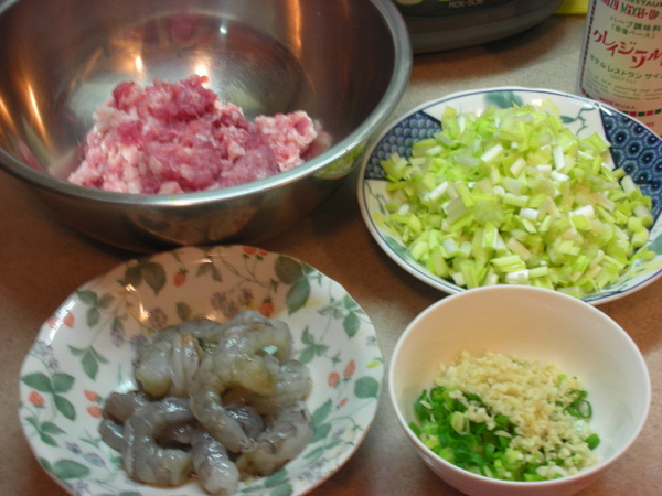 主料 / 中筋麵粉 1斤、絞肉 10兩、蝦仁 4兩、韭黃 半把、蔥 1支、薑 1塊
