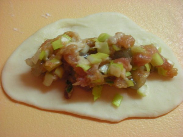 再入韭黃、加一點米酒,持續攪拌產生黏稠狀,即成餡料。