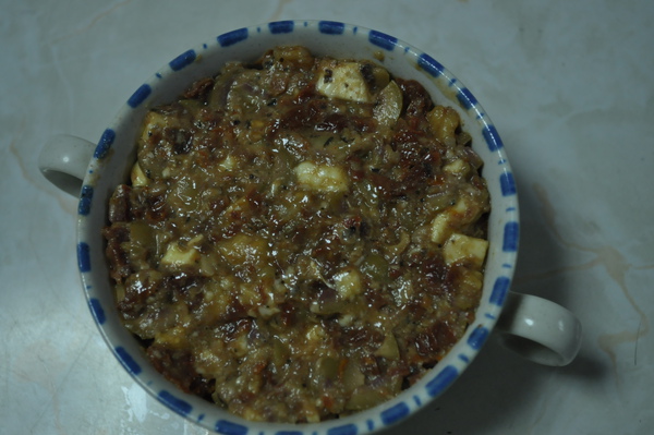 核桃百里香醬汁:橄欖油,新鮮百里香,鹽及黑胡椒適量,核桃(150度烤熟切碎)